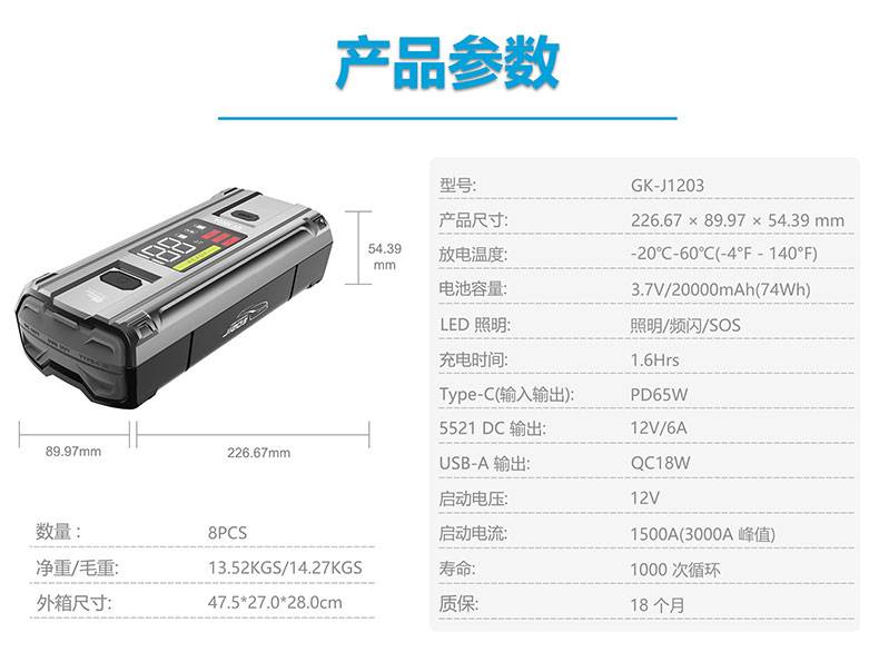 ​格睿铠铂适配车型12V工作温度-20℃-60℃循环次数1000产品认证CE,FCC,RoHS,PSE,UL2743重量1.63KG外形尺寸226.67*89.97*54.39mm质保18个月启动电流1500A峰值电流3000A附带功能频闪灯,充电宝附送工具智能夹输出电压12V产品系列GK-J1203显示方式LED指示灯电池容量20000mAh**强大的便携式汽车应急启动电源**:3000A峰值电流,配备20000mAh大容量,能够为大多数12V车辆启动,包括摩托车、雪地摩托、汽车、
